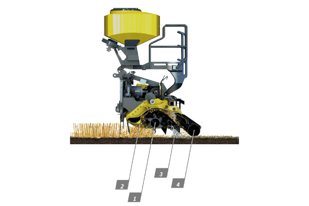Die Hauptkomponenten des CoverSeeders 600 bestehen aus dem Rotor (1) mit variabel einstellbarer Gegenschneide (2), der Säschiene (3) und der Stützwalze (4). Im ersten Arbeitsschritt werden die Stoppeln durch den Doppelspiralrotor bodennah abgetrennt und die gesamte organische Masse durch den Sogeffekt von der Oberfläche aufgenommen, sodass eine Bodenoberfläche frei von Ernteresten entsteht. Mithilfe der Gegenschneide kann der Zerkleinerungsgrad der Erntereste variabel angepasst und die Sogwirkung zusätzlich variiert werden. So stellen auch die Aufnahme und Verarbeitung von grünem, unreifem Stroh kein Hindernis dar. Speziell geformte Prallteller innerhalb der Säschiene ermöglichen eine gleichmäßige und flächendeckende Ausbringung im Breitsaatverfahren auf die unmittelbar zuvor geräumte Bodenoberfläche. Oberhalb der Säschiene gibt der Rotor das aufbereitete organische Material wieder frei, sodass die erforderliche Bedeckung des Saatgutes durch die Mulchschicht gewährleistet wird. Die Stützwalze sorgt abschließend für einen guten Bodenschluss und liefert somit optimale Keimbedingungen für das Saatgut.