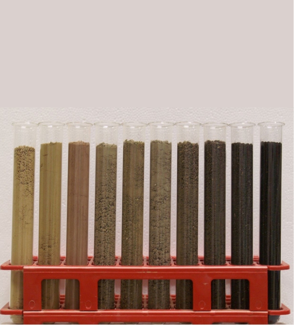 Die Bodenproben (von links nach rechts) haben folgenden Humusgehalt (Angaben in %):